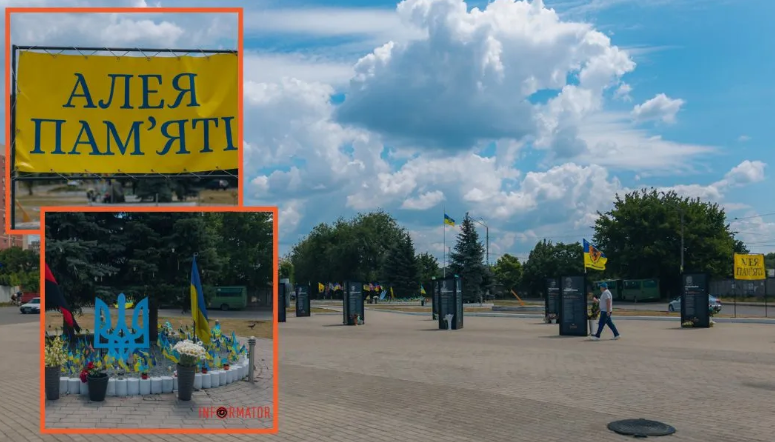 На місці також є тригранні конструкції. На них є зображення воїнів, інформація про них, а також qr-код з детальною біографією полеглого Захисника. Біля кожної конструкції ми помітили квіти та прапор. Поруч є ділянки з великими прапорами та маленькими, які вставлені в землю.